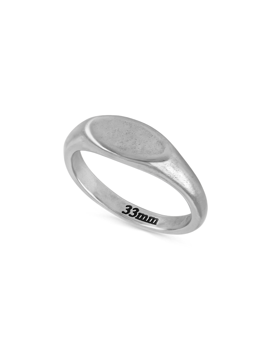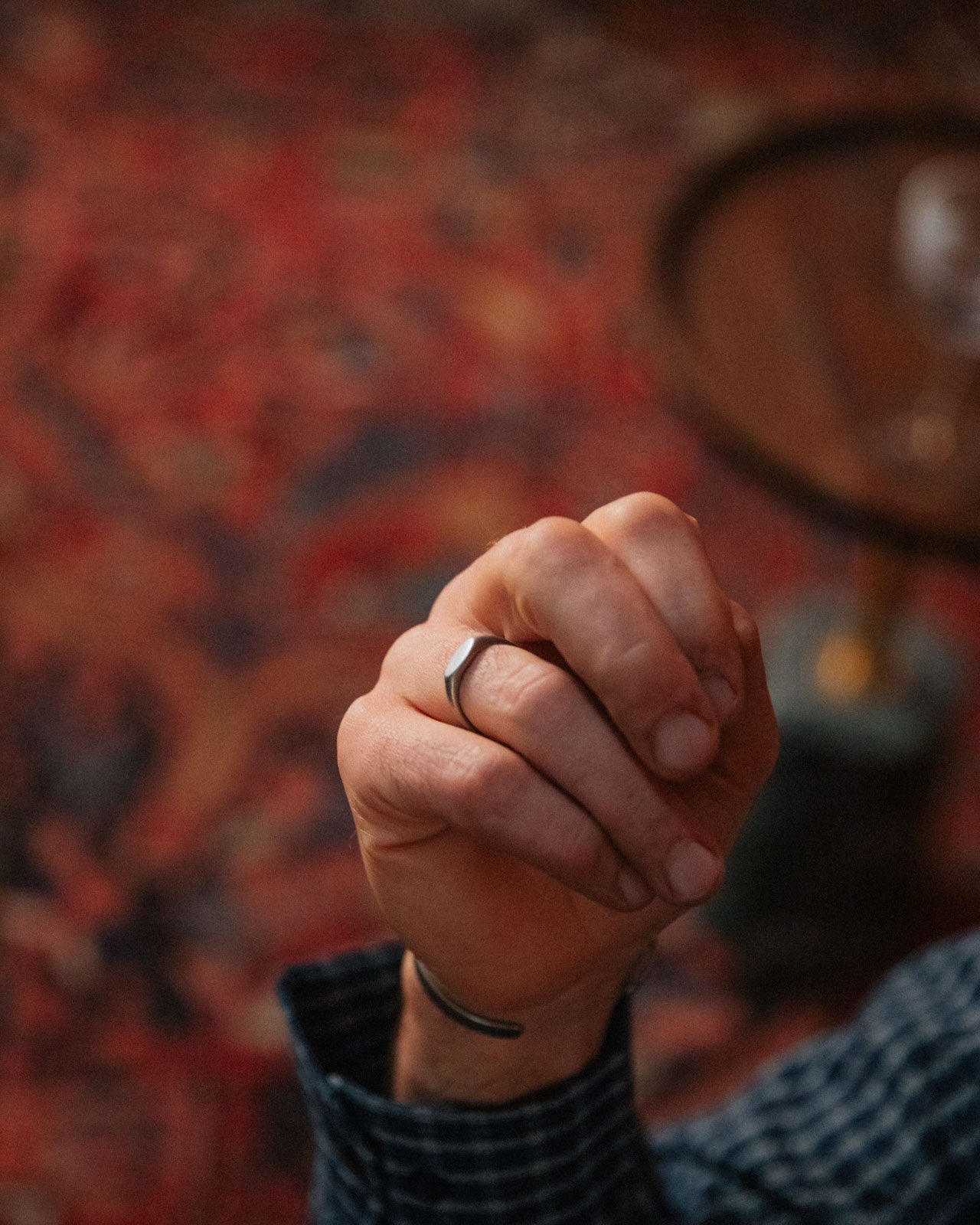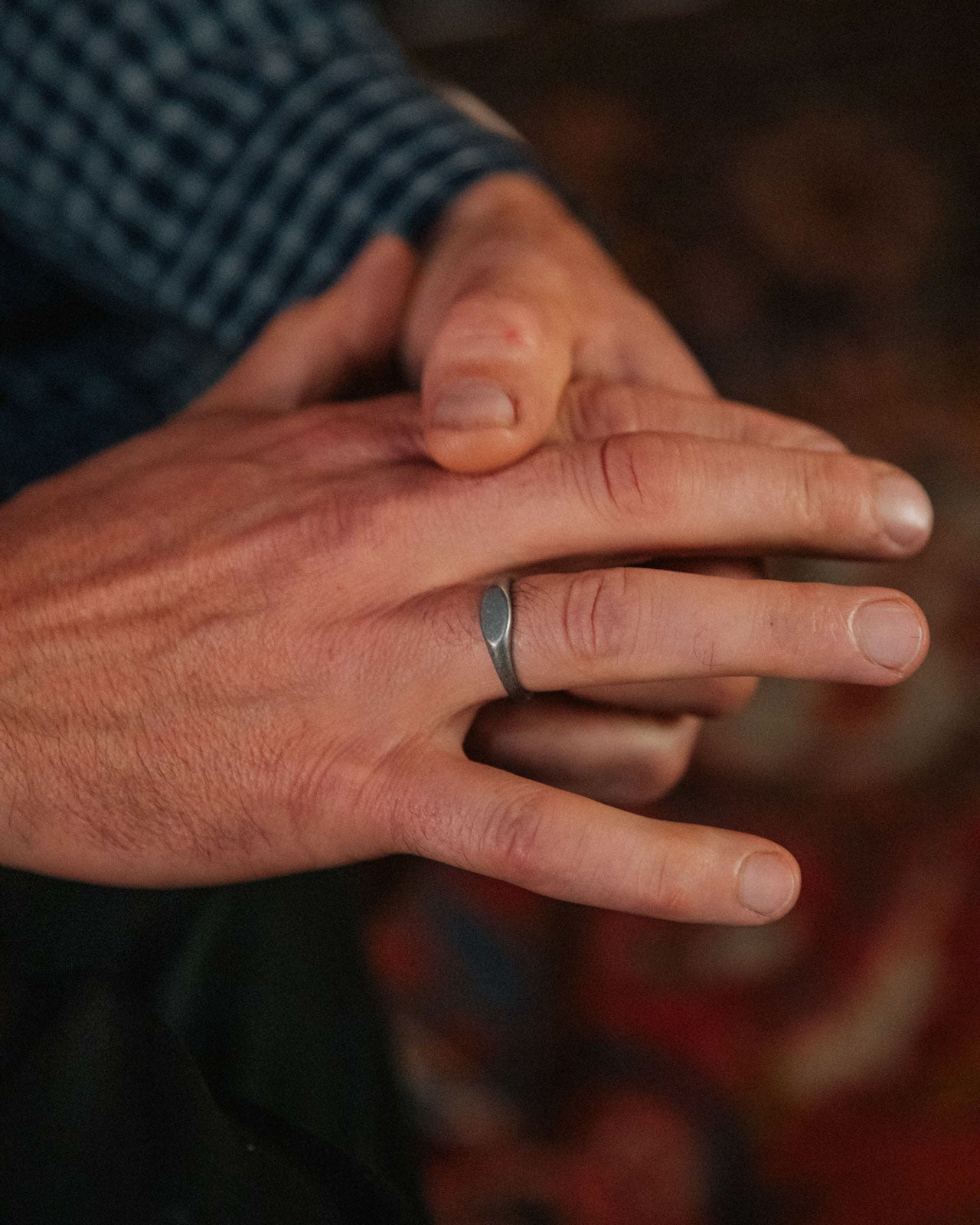 A slim signet with an oxidised finish. A piece with character polished into it. Wear daily to leave the mark of your own story.