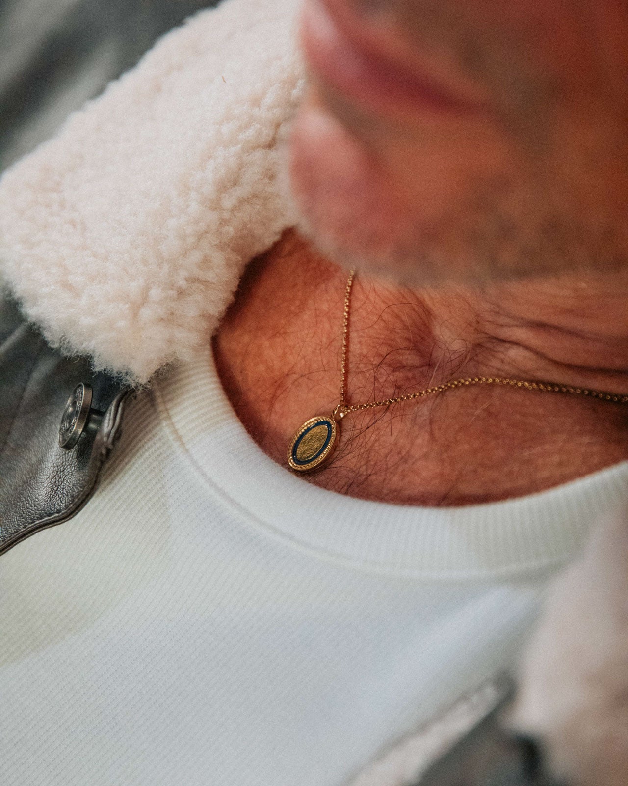 An oval textured pendant with a deep blue border and beaded frame. Reminiscent of the moon amongst an all-knowing midnight sky.
