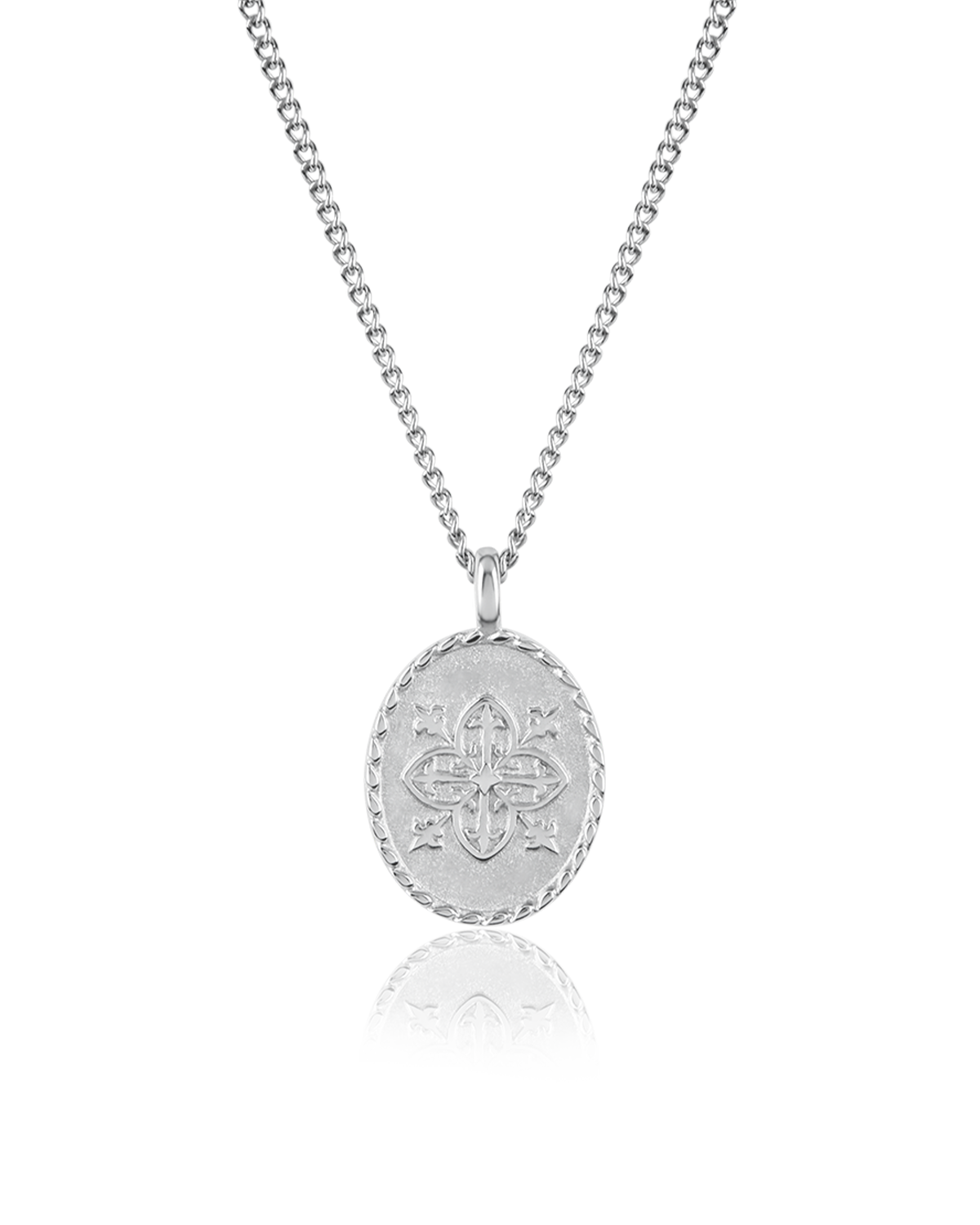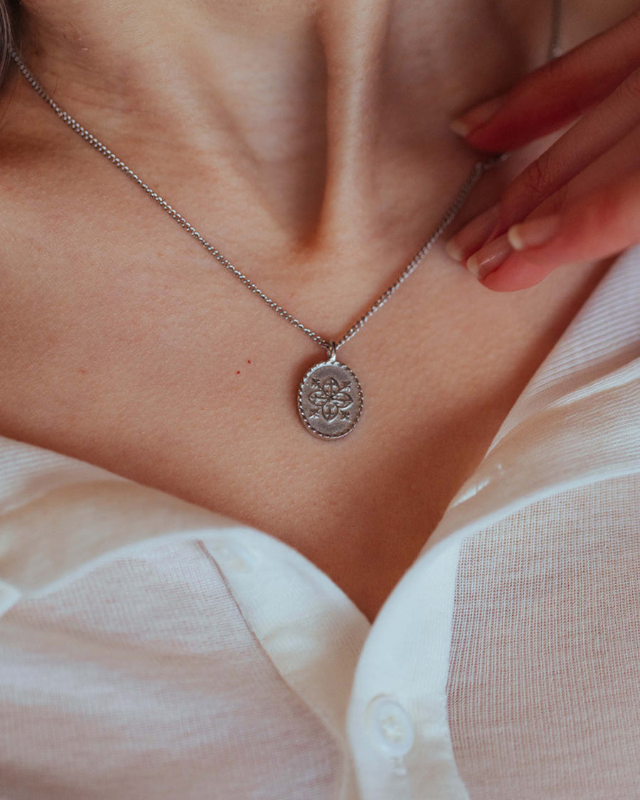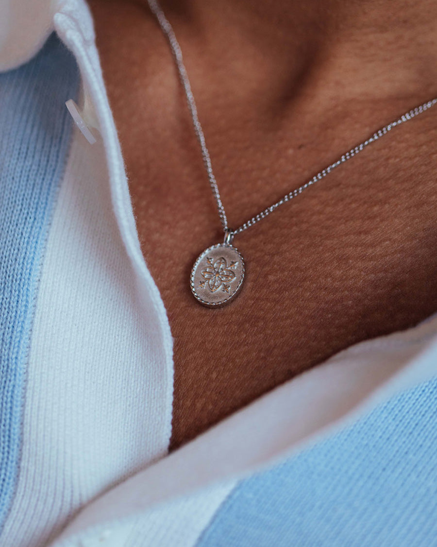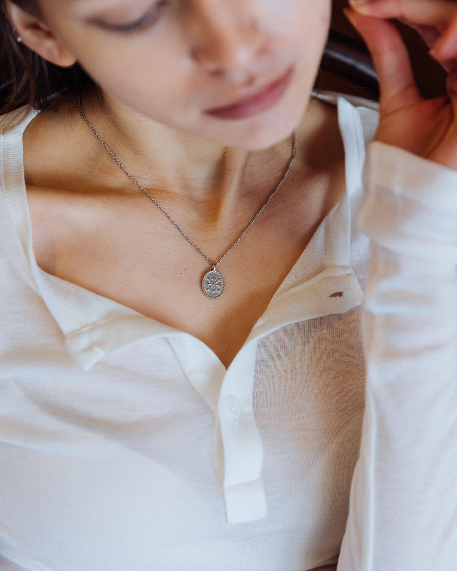 A delicate oval pendant with a quatrefoil motif, a medieval symbol used to bring protection and harmony. The pendant, and the name ‘Clovis’, represent the timeless connection between us and nature.
