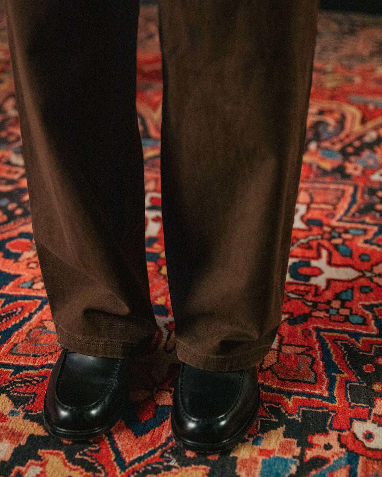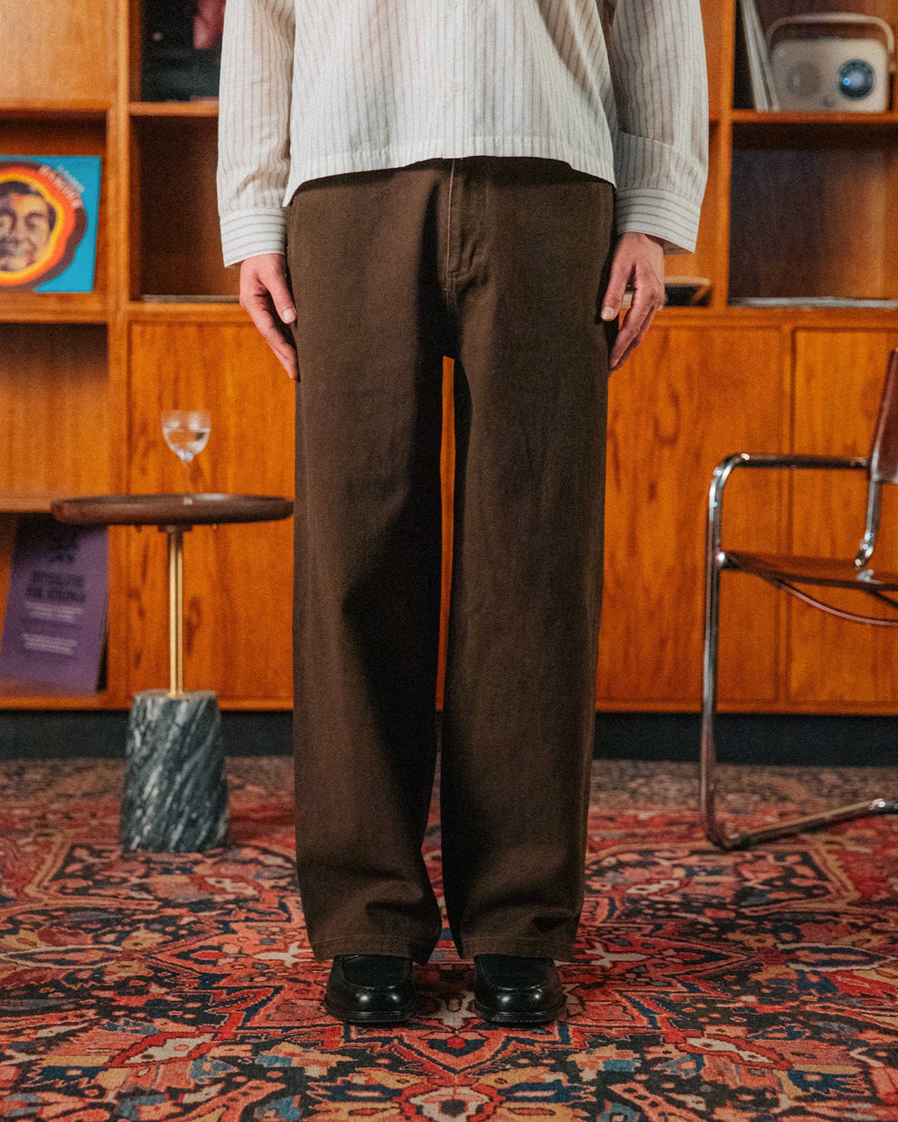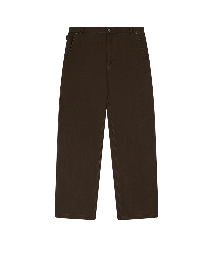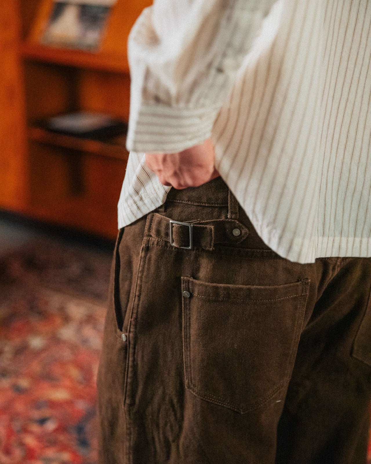 Denim work pants in a deep cigar brown with a straight leg fit. See the utility inspiration through the side adjuster buckles and rivet details.