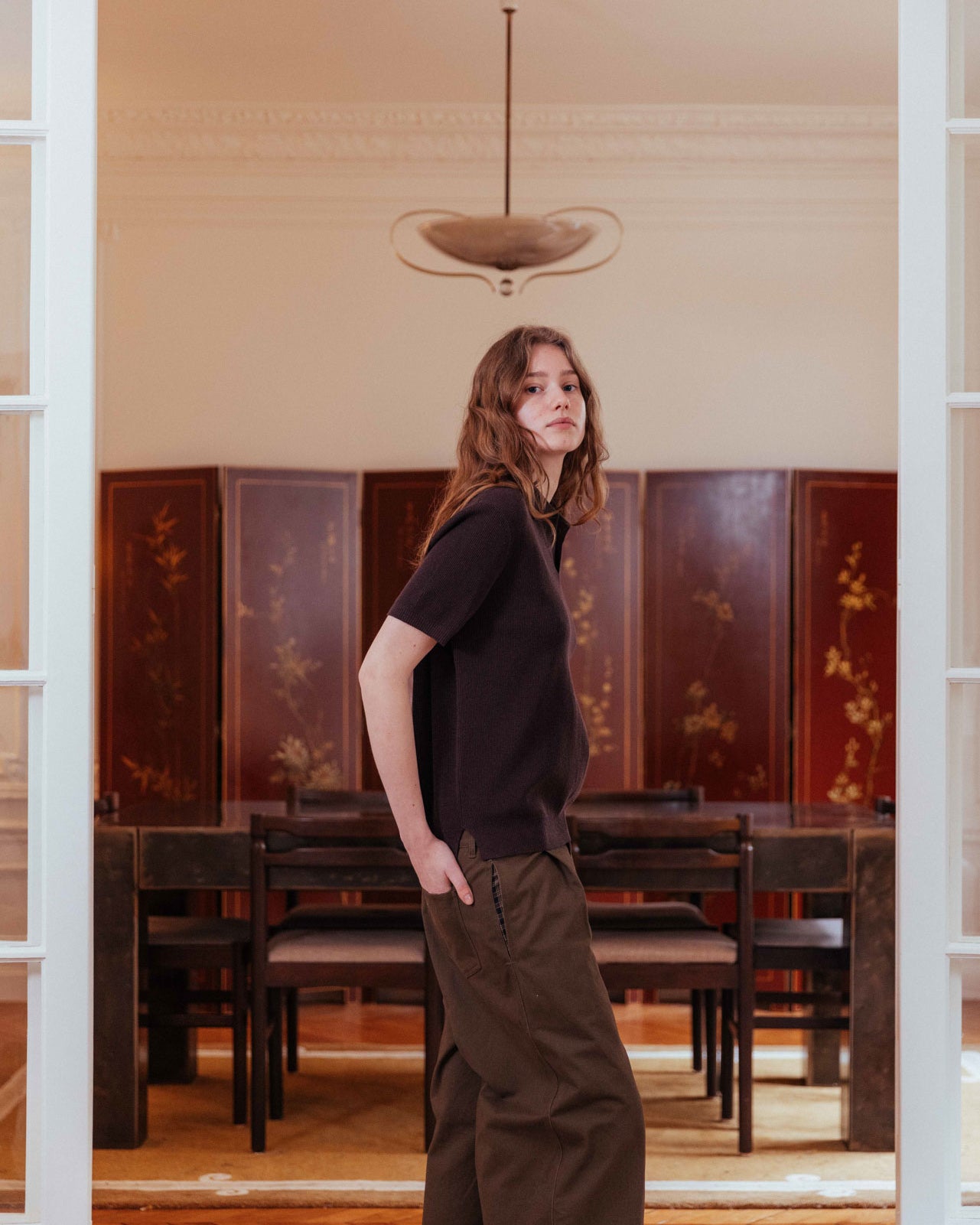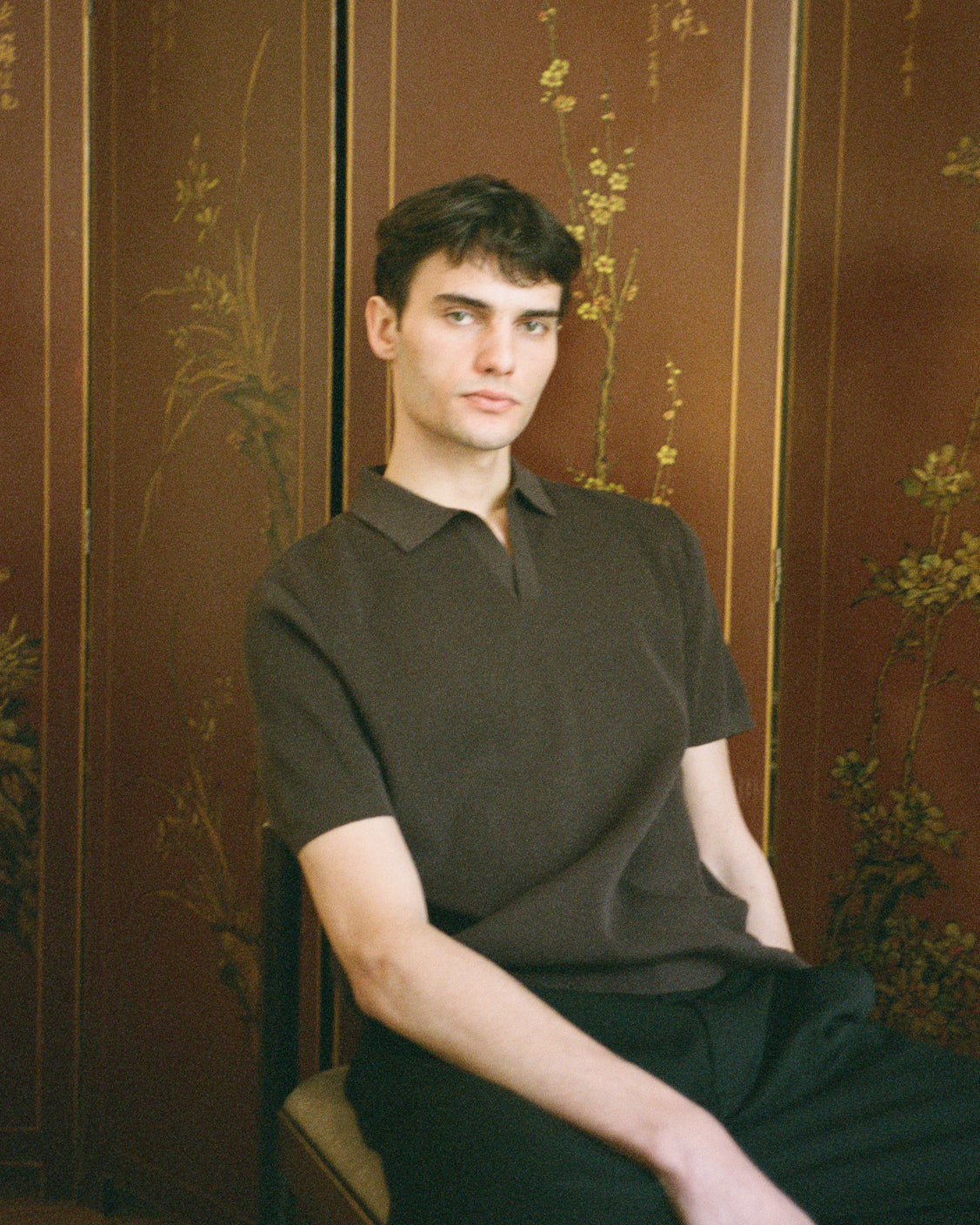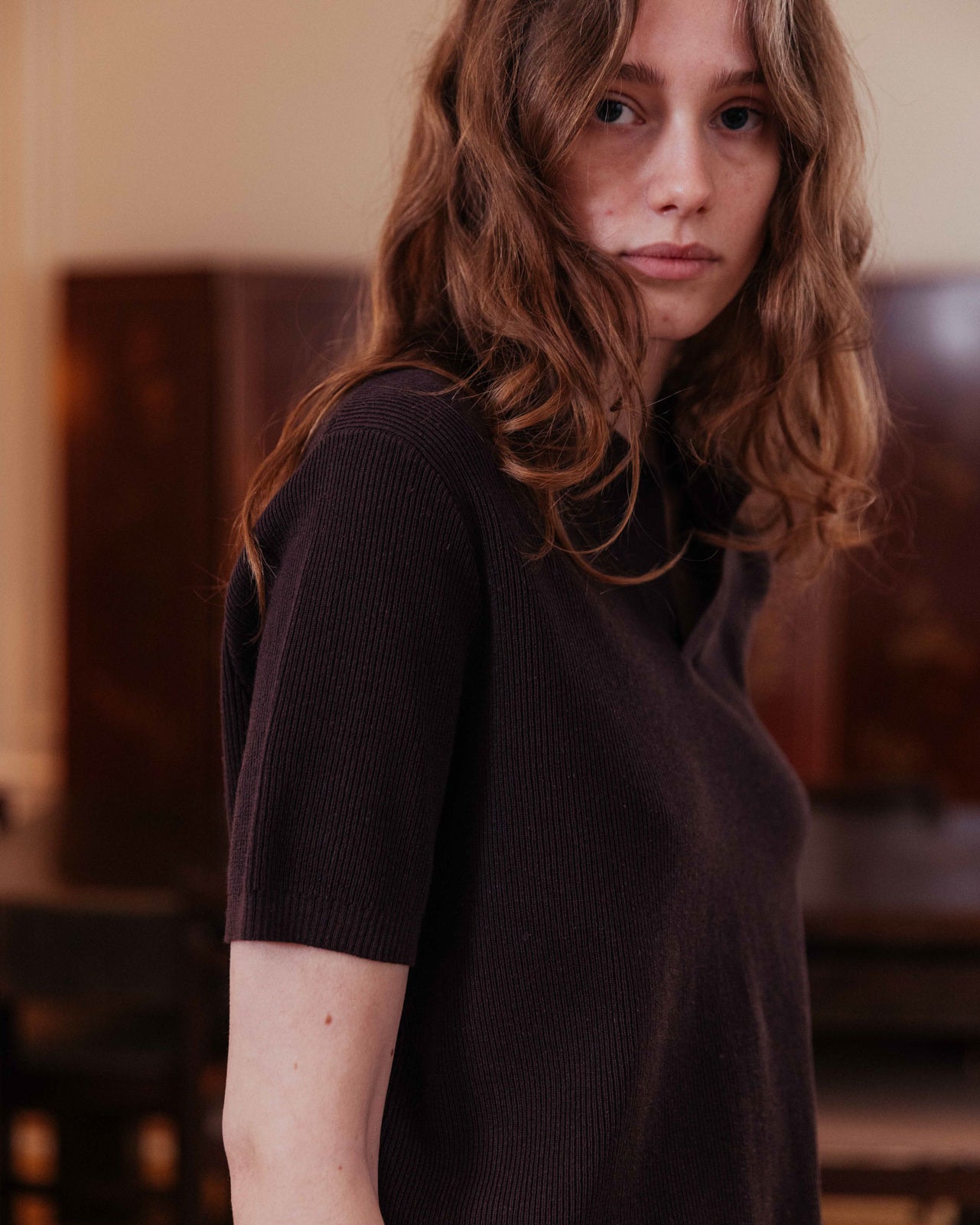 In a deep, powdery cocoa, this boxy polo melts over the body. Featuring a relaxed open collar, the lightweight ribbed knit is a timeless option for warm-weather styling.