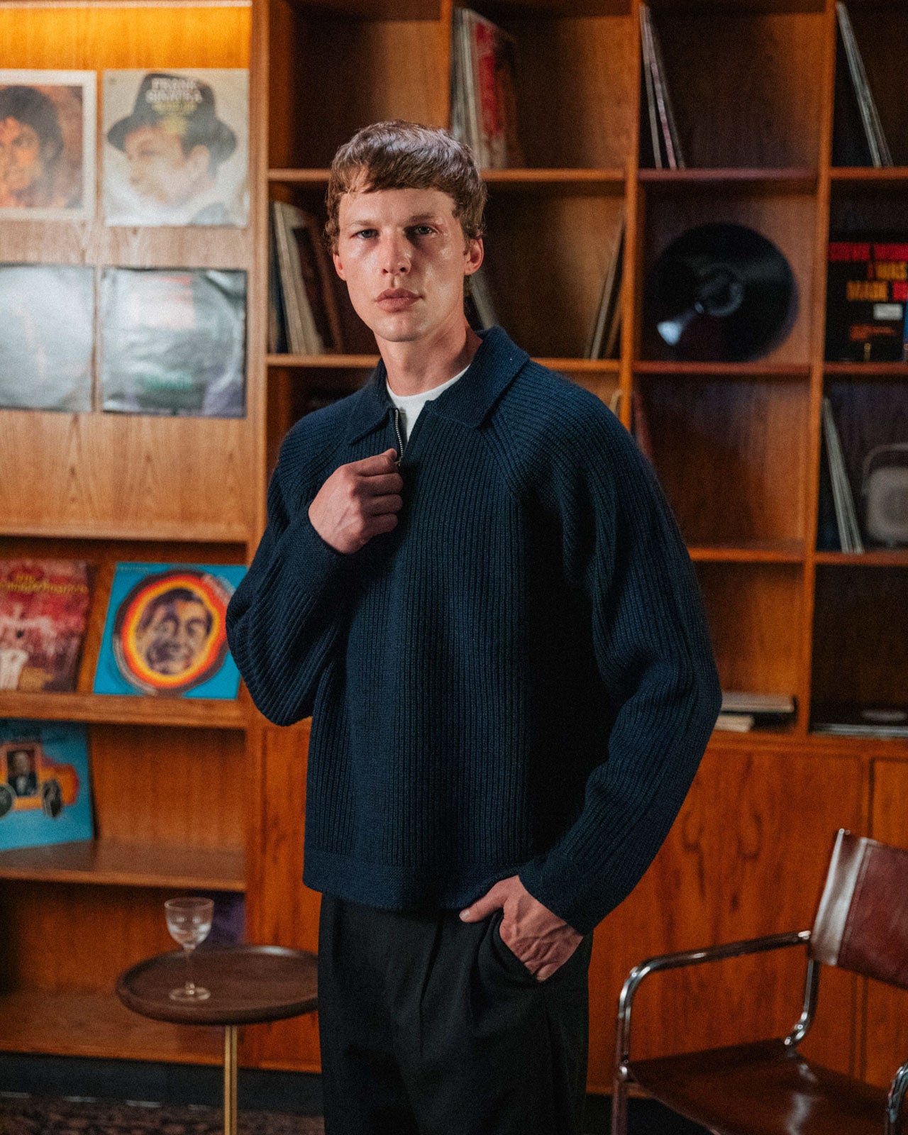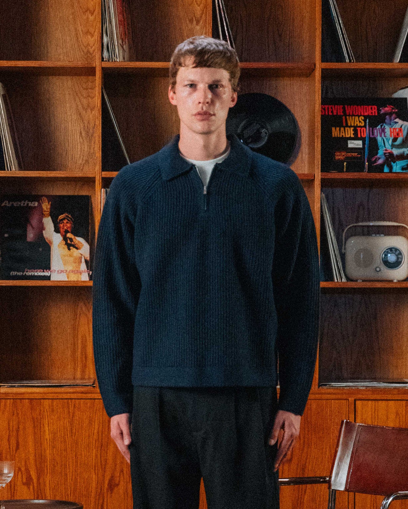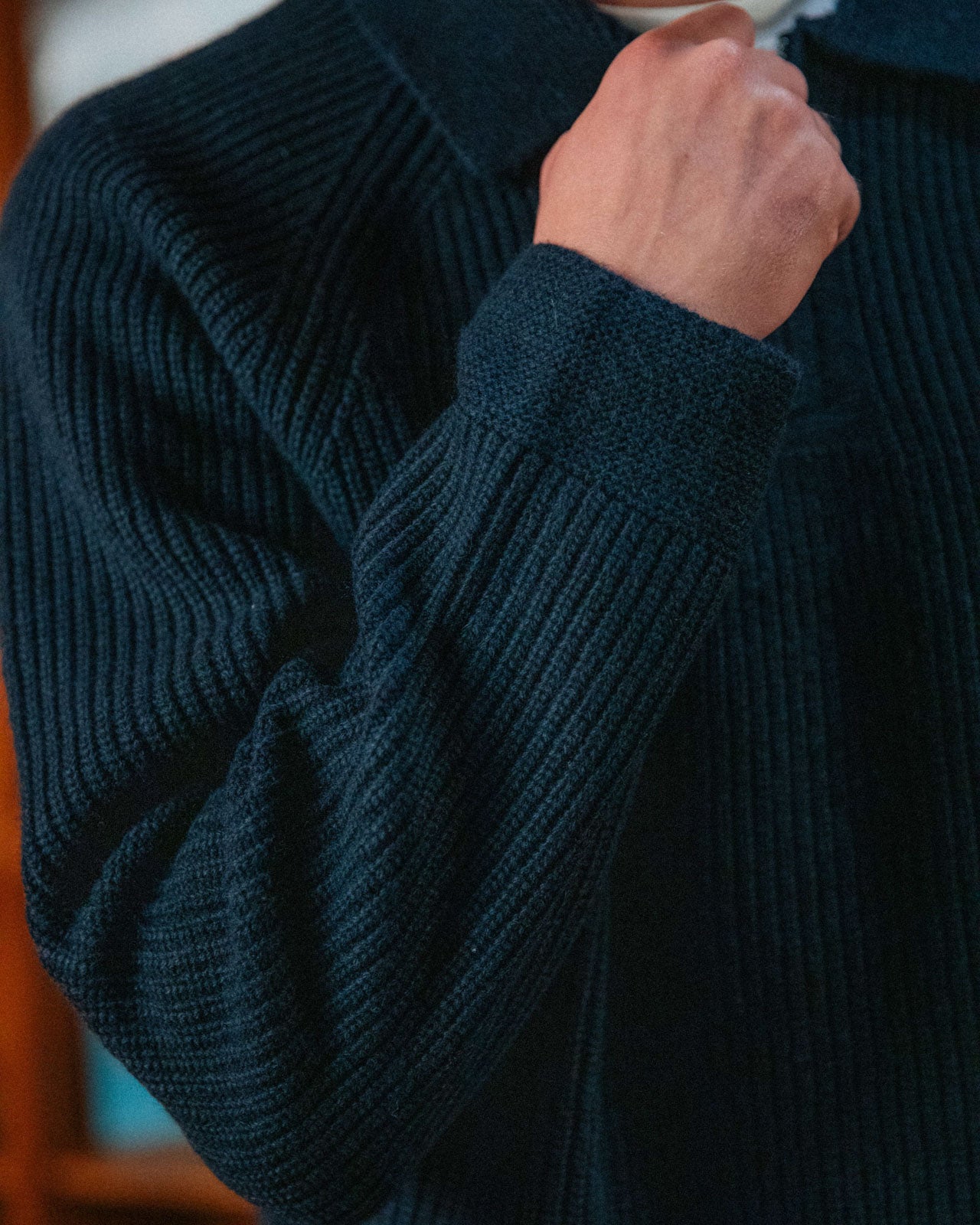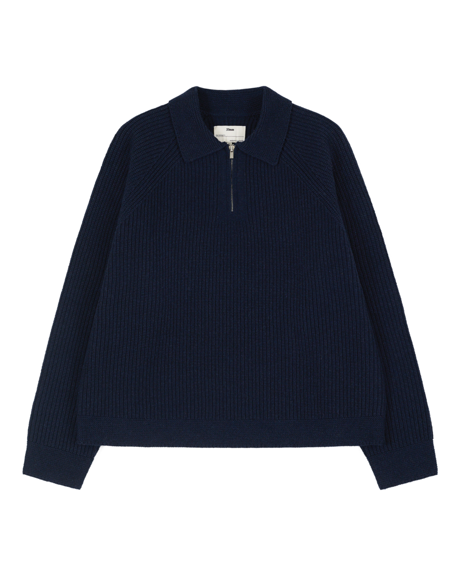 A layer that doesn't sacrifice the fit, but teases the tee underneath. A ribbed knit with raglan sleeves, quarter zip and relaxed collar. Complete with a custom branded zip and 33mm tab on the reverse.