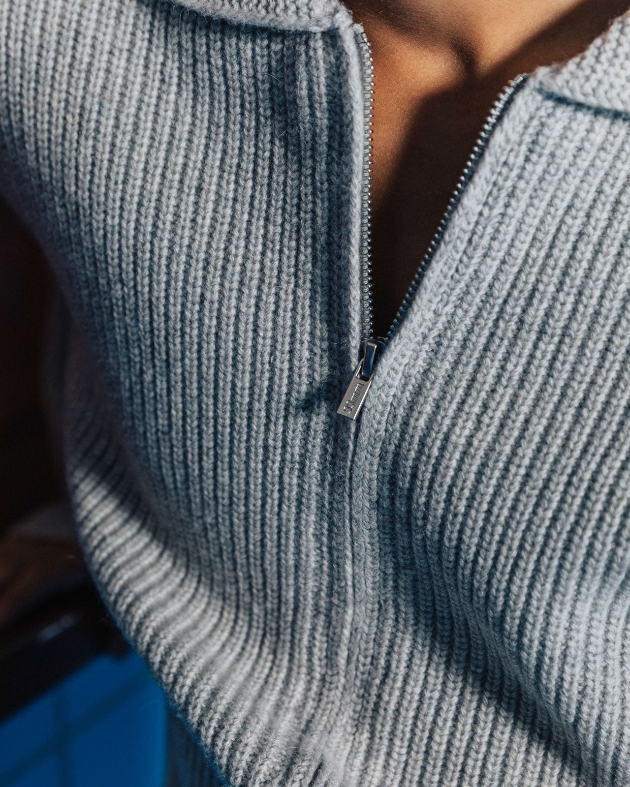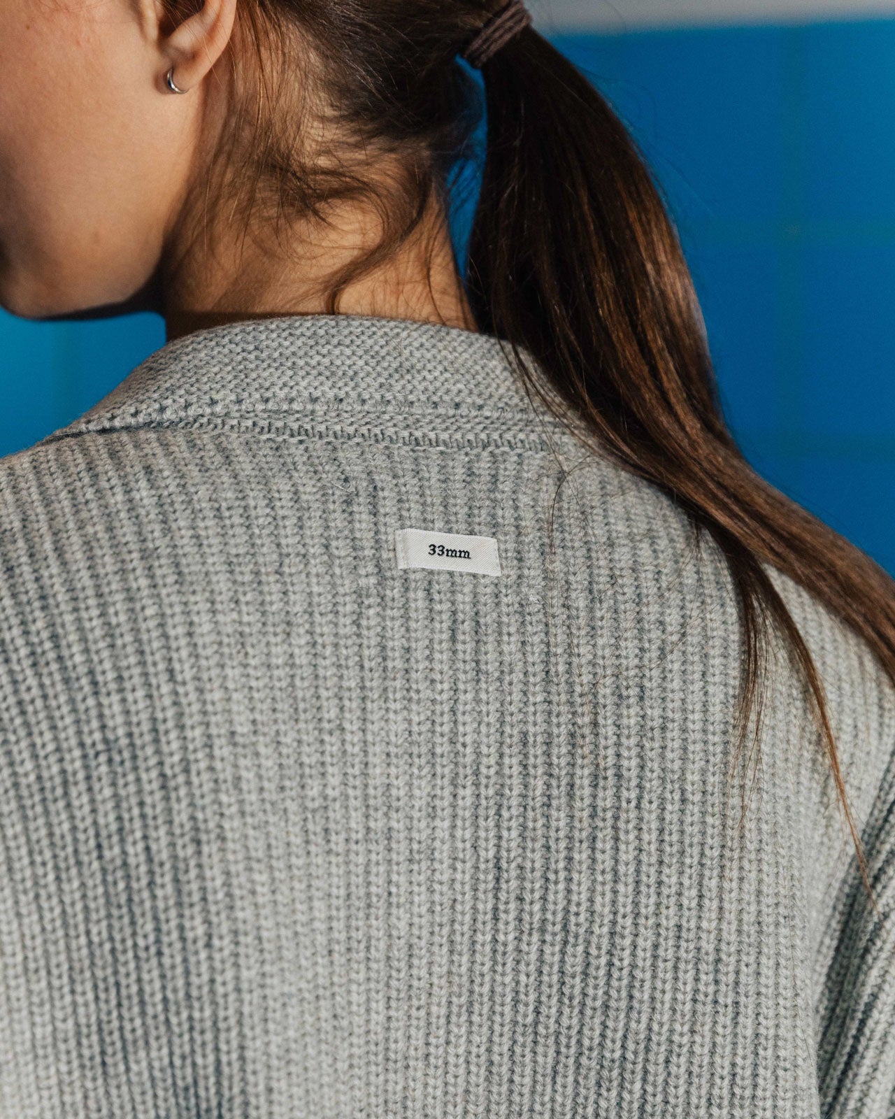 A heavyweight knit zip-up with a flat-edged knit collar and front patch pockets. Adorned with double ended branded zips so you can layer and style it the way you want to.