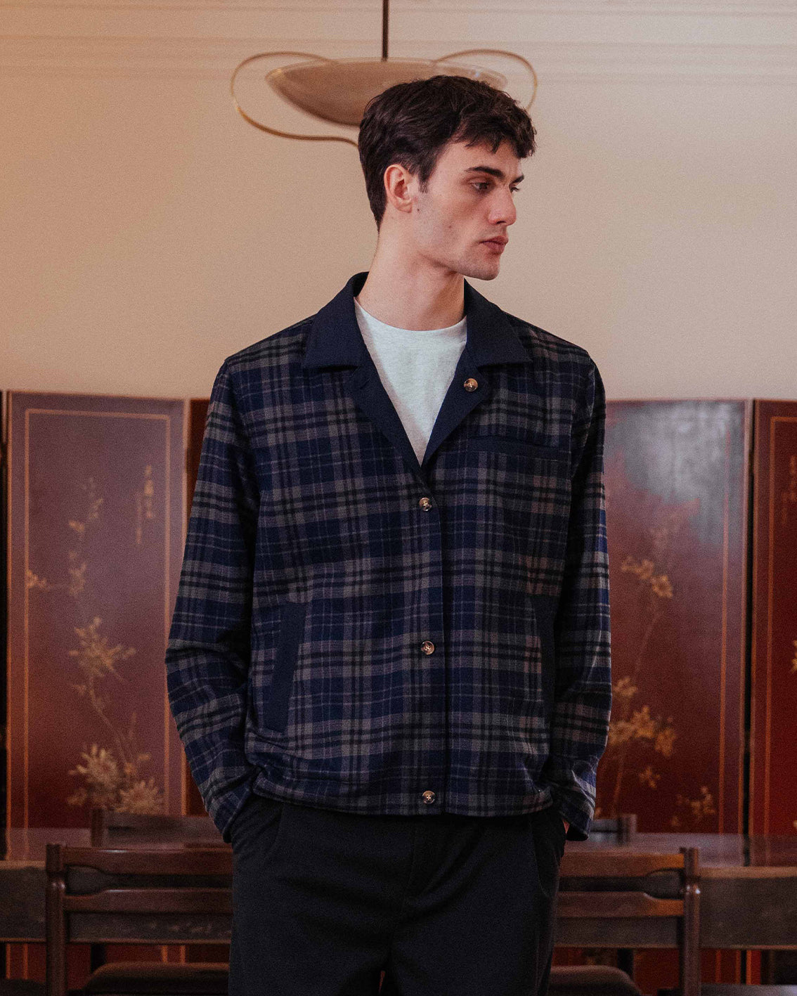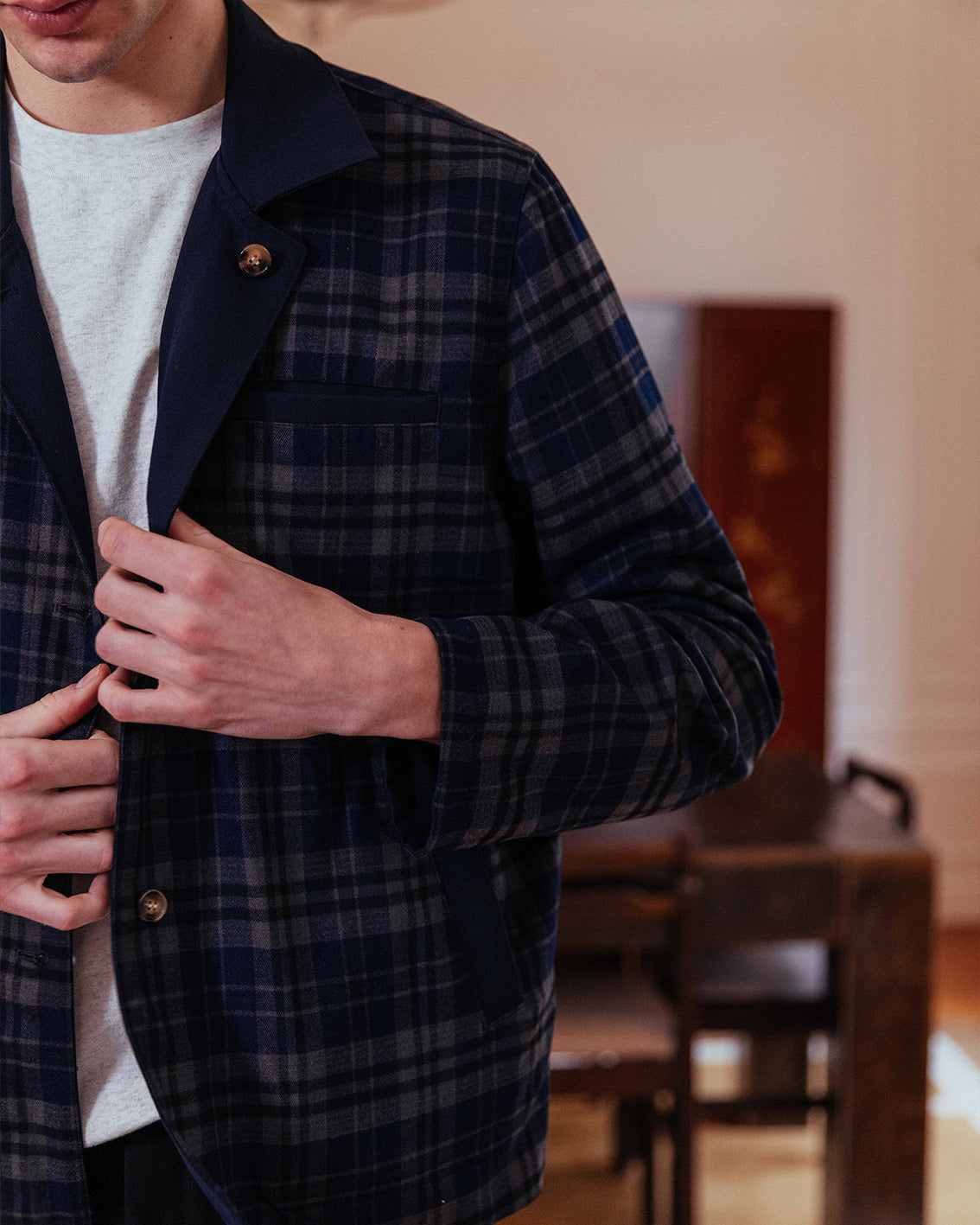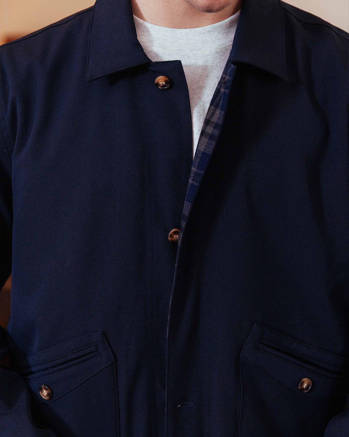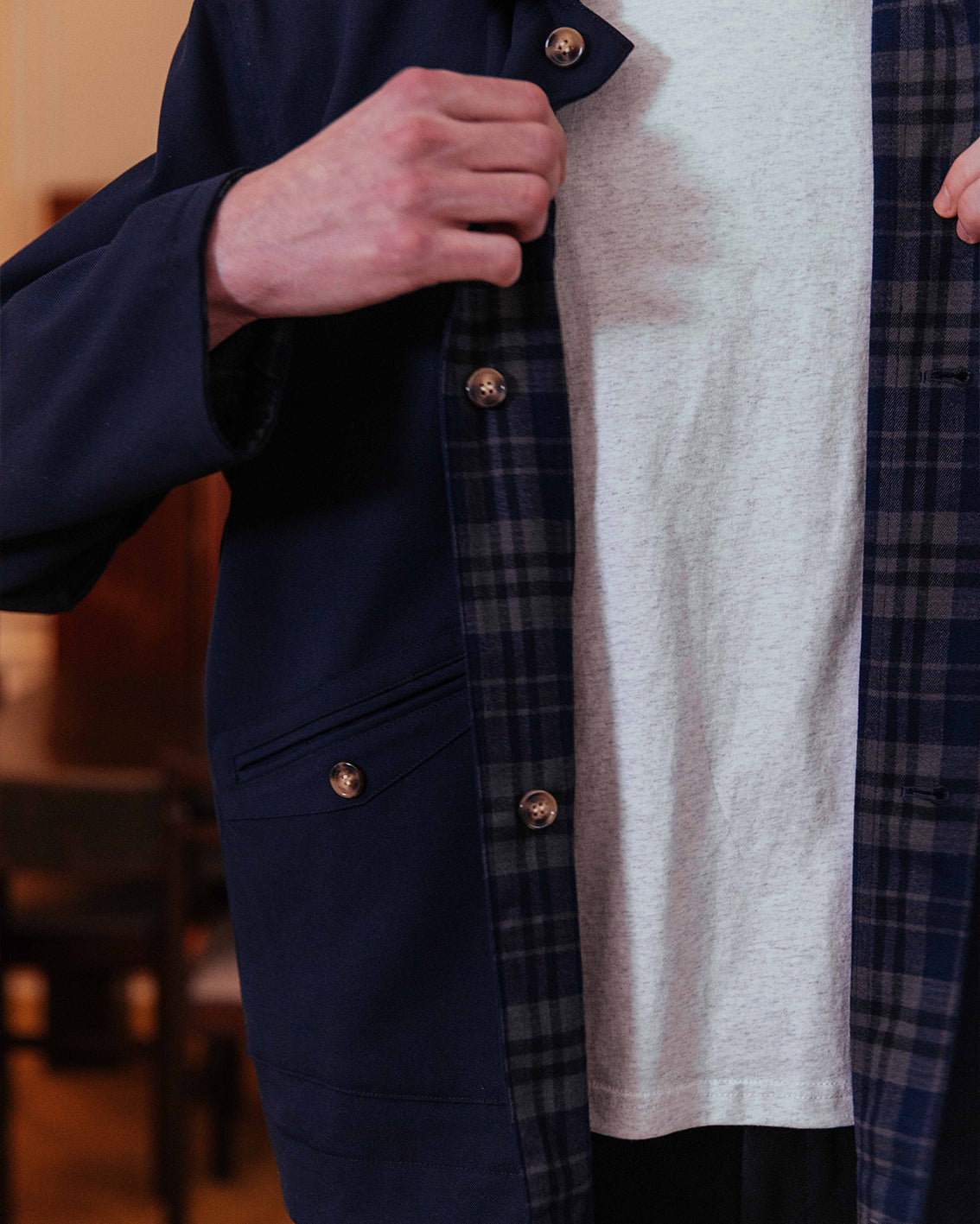 A fully reversible work jacket offering two looks in one, with the choice of a deep navy base or classic check. Welt pockets define the navy side, whilst we kept it simple on the check to let the print sing.