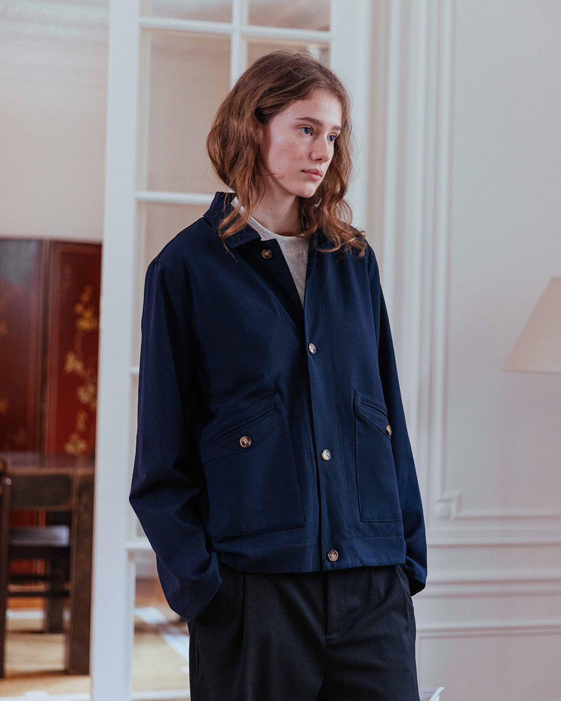• Boxy silhouette with a subtle crop